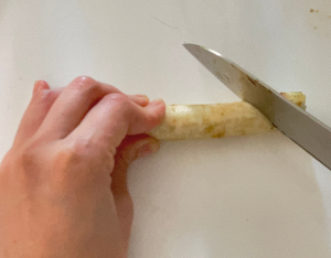 幅をしっかり揃えて切ることで、火の通りが均一になりますよ。