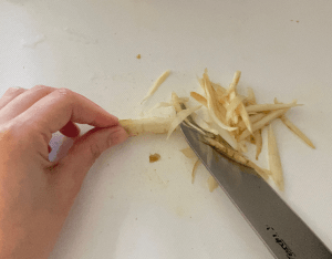 - 薄く切ったごぼうを重ねて、端の方から約3mm程度に切っていく。